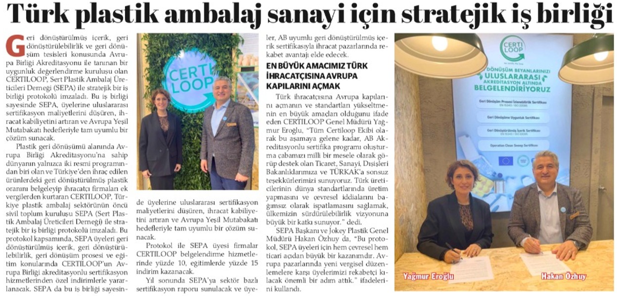 CERTILOOP—one of only two official programs worldwide holding European Union Accreditation in the field of plastic recycling—documents the recycled plastic content in products exported from Türkiye and enables exporters to avoid additional taxes. Within this framework, CERTILOOP has entered into a strategic cooperation agreement with SEPA, one of the leading non-governmental organizations in Türkiye’s plastic packaging sector.
