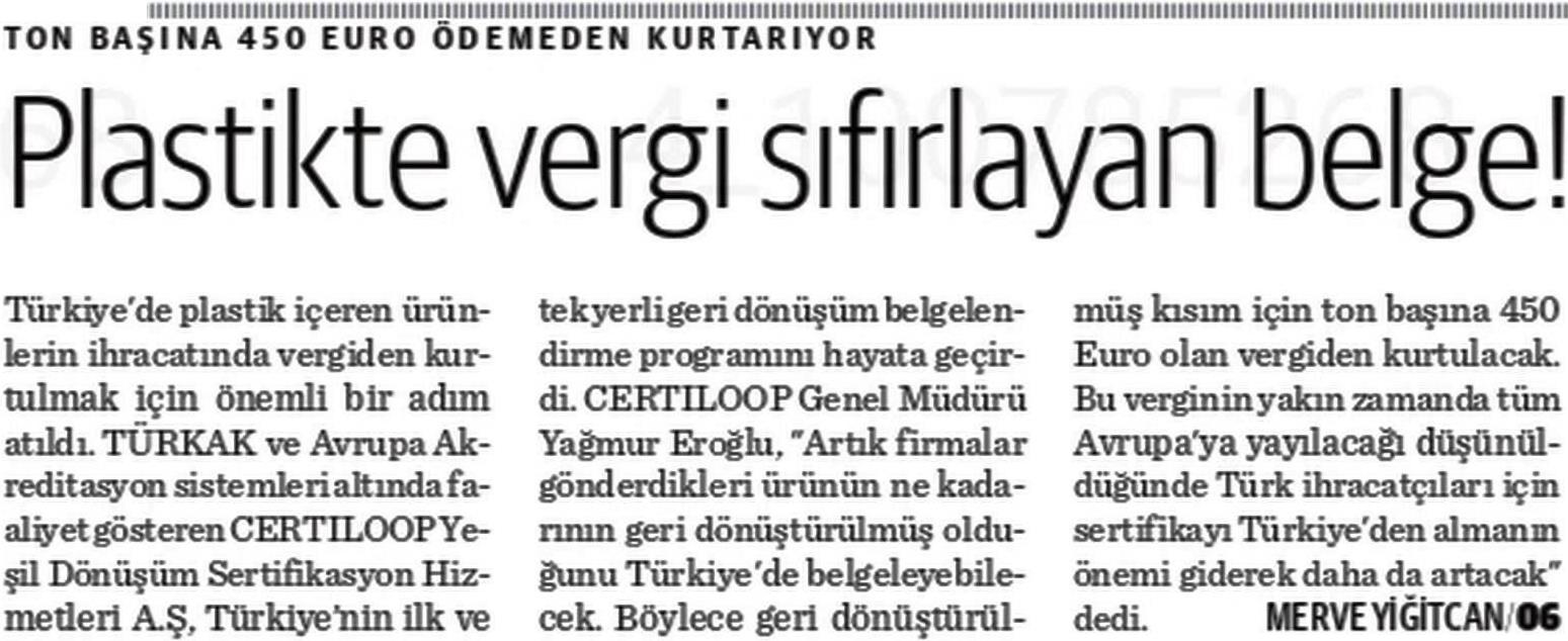 Türkiye has taken a significant step to provide tax advantages in the export of plastic-containing products. CERTILOOP Green Transformation Certification Services Inc. has launched Türkiye’s first and only domestic recycling certification program, paving the way for Turkish exporters to ship their products to Europe without being subject to additional taxes.