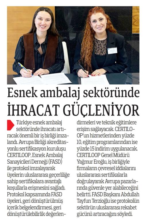 CERTILOOP, which is recognized by the European Union in the field of plastic recycling and operates one of only two accredited programs worldwide, enables companies to access EU markets without facing additional tax burdens by certifying the use of recycled content in exports. Under the protocol, FASD members will benefit from a 10% discount on CERTILOOP’s certification services and a 15% discount on training programs. In addition, a sector-specific certification and regulatory compliance report tailored exclusively for the association will be prepared at the end of the year.