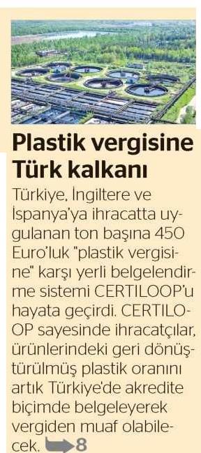 İngiltere ve İspanya'ya ihracat yapan firmaların daha önce bu belgeyi sadece Belçika'da kurulu bir kuruluştan almak zorunda olduklarını belirten CERTILOOP Genel Müdürü Yağmur Eroğlu, şu anda dünyada iki akredite kuruluştan biri haline geldiklerini belirtti. Eroğlu, Avrupa'da uygulanmaya başlanan ve giderek genişleyecek olan 'AB plastik vergisi' ile ilgili süreci şöyle anlattı: