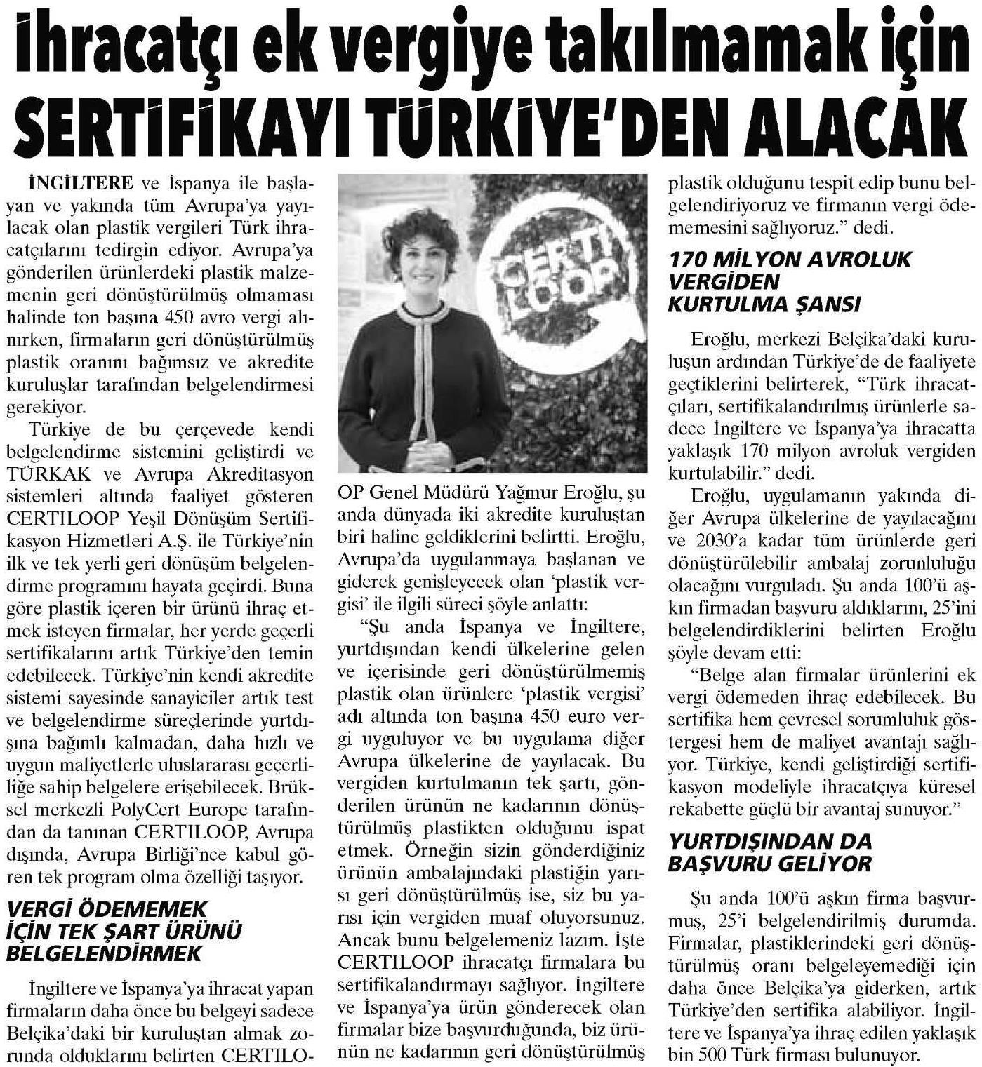 Türkiye plastik içeren ürünlerin ihracatında vergi avantajı sağlamak için önemli bir adım attı. CERTILOOP Yeşil Dönüşüm Sertifikasyon Hizmetleri A.Ş., Türkiye'nin ilk ve tek yerli geri dönüşüm belgelendirme programını hayata geçirirken, Türk ihracatçıların ek vergiye tabi olmadan ürünlerini Avrupa'ya göndermesinin yolunu açtı. İngiltere ve İspanya'ya ihracat yapan firmaların 'plastik vergisi' ödememek için daha önce bu belgeyi sadece Belçika'da kurulu bir kuruluştan almak zorunda olduklarını belirten CERTILOOP Genel Müdürü Yağmur Eroğlu, "Artık firmalar gönderdikleri ürünün ne kadarının geri dönüştürülmüş olduğunu Türkiye'de belgeleyebilecek. Böylece geri dönüştürülmüş kısım için ton başına 450 euro olan vergiden kurtulacak. Bu verginin yakın zamanda tüm Avrupa'ya yayılacağı düşünüldüğünde Türk ihracatçıları için sertifikayı Türkiye'den almanın önemi giderek daha da artacak." dedi.