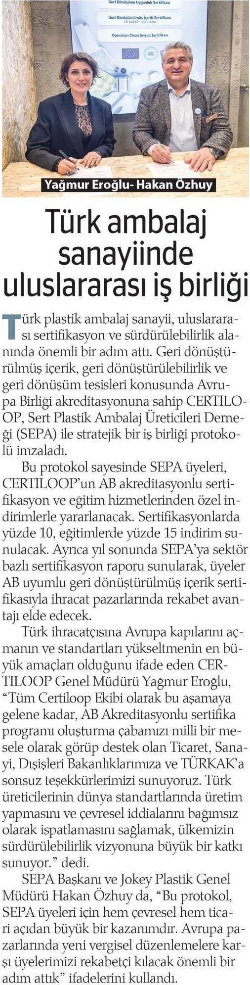 Under the protocol, SEPA members will benefit from CERTILOOP’s EU-accredited certification services at special discounted rates in the areas of recycled content, recyclability, recycling processes, and training. Through this partnership, SEPA will provide its members with a solution that lowers international certification costs, strengthens export capacity, and ensures full compliance with the European Green Deal.