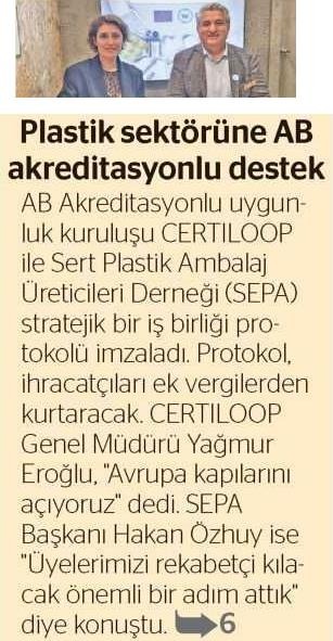 CERTILOOP—one of only two official programs worldwide holding European Union Accreditation in the field of plastic recycling—documents the recycled plastic content in products exported from Türkiye and enables exporters to avoid additional taxes. Within this framework, CERTILOOP has entered into a strategic cooperation agreement with SEPA, one of the leading non-governmental organizations in Türkiye’s plastic packaging sector.