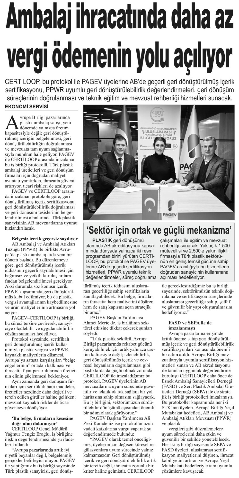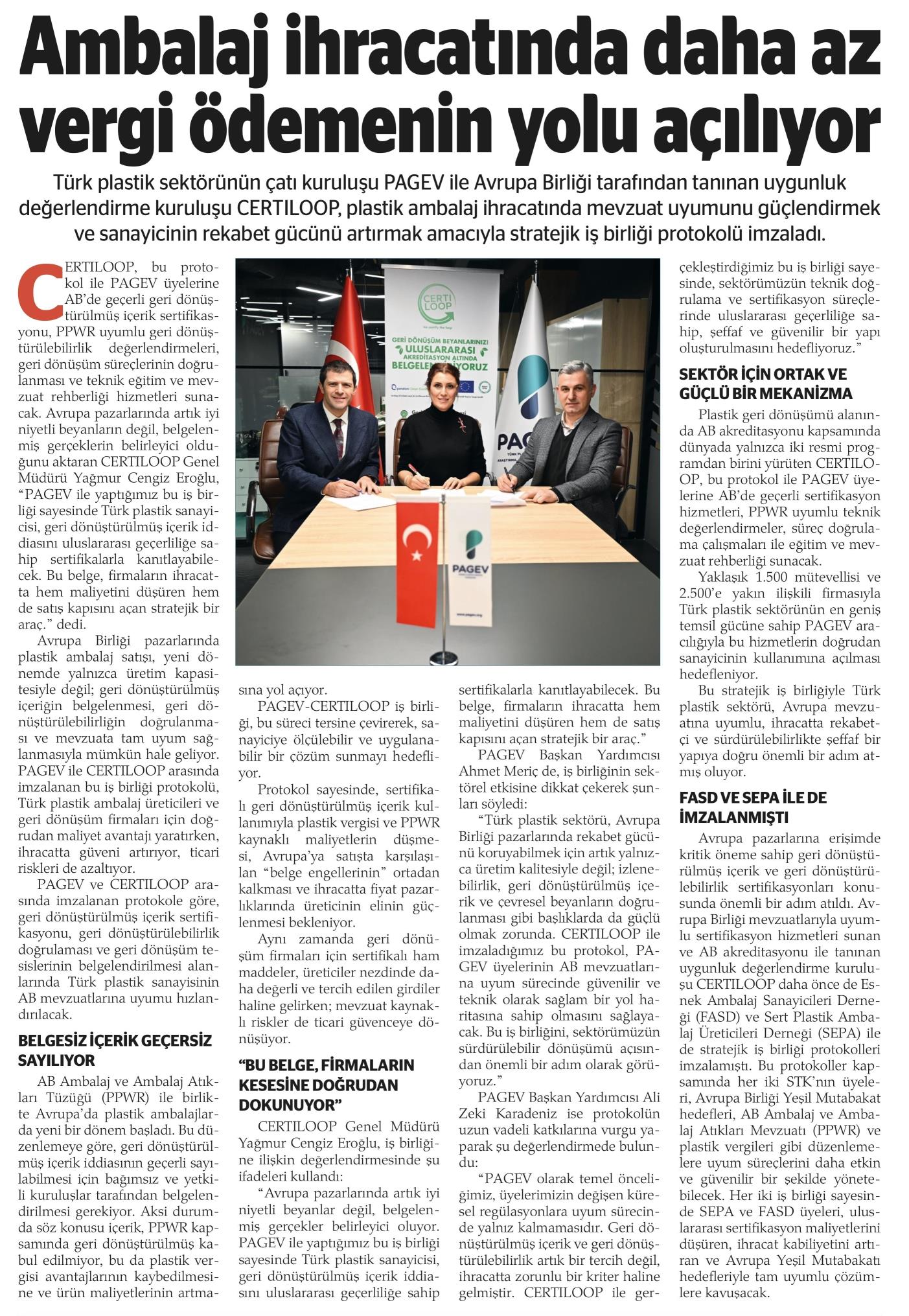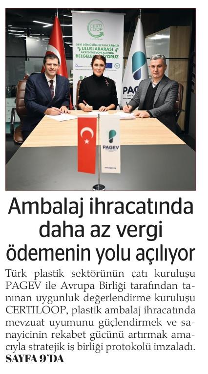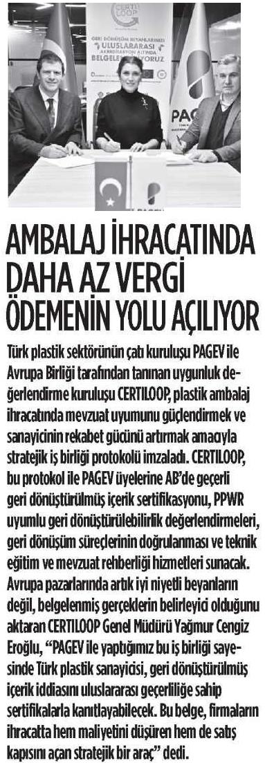 PAGEV (Plastic Packaging Manufacturers Association), the umbrella organization of the Turkish plastics industry, and CERTILOOP, an EU-recognized conformity assessment body, have signed a strategic cooperation protocol aimed at strengthening regulatory compliance in plastic packaging exports and enhancing the competitiveness of manufacturers.