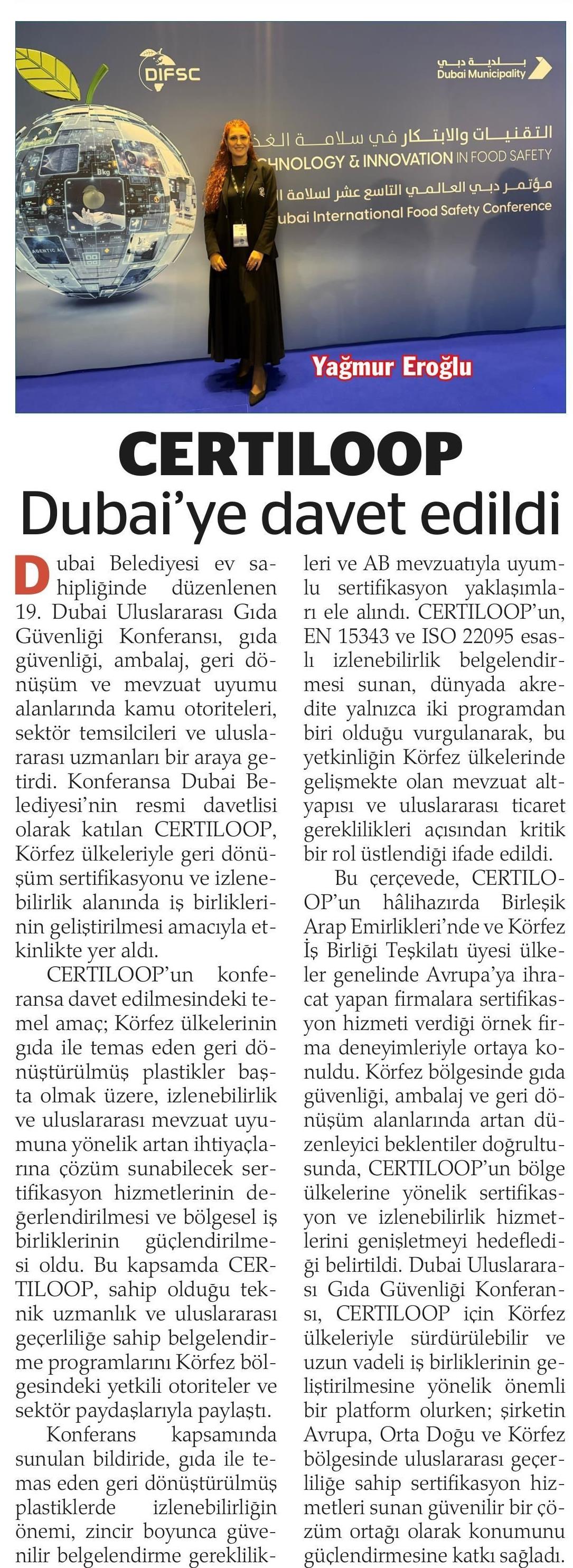 Dubai Belediyesi ev sahipliğinde düzenlenen 19. Dubai Uluslararası Gıda Güvenliği Konferansı (DIFSC-Dubai International Food Safety Conference), gıda güvenliği, ambalaj, geri dönüşüm ve mevzuat uyumu alanlarında kamu otoriteleri, sektör temsilcileri ve uluslararası uzmanları bir araya getirdi. Konferansa Dubai Belediyesi’nin resmi davetlisi olarak katılan CERTILOOP, Körfez ülkeleriyle geri dönüşüm sertifikasyonu ve izlenebilirlik alanında iş birliklerinin geliştirilmesi amacıyla etkinlikte yer aldı.