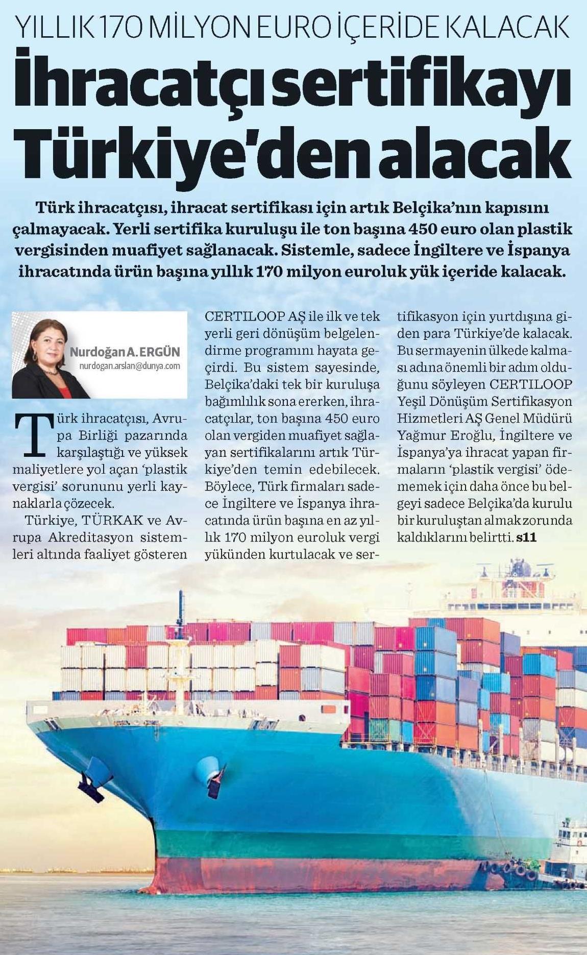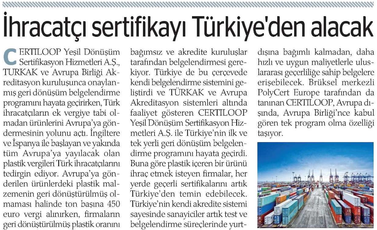 Türkiye plastik içeren ürünlerin ihracatında vergi avantajı sağlamak için önemli bir adım attı. CERTILOOP Yeşil Dönüşüm Sertifikasyon Hizmetleri A.Ş., Türkiye'nin ilk ve tek yerli geri dönüşüm belgelendirme programını hayata geçirirken, Türk ihracatçıların ek vergiye tabi olmadan ürünlerini Avrupa'ya göndermesinin yolunu açtı. İngiltere ve İspanya'ya ihracat yapan firmaların 'plastik vergisi' ödememek için daha önce bu belgeyi sadece Belçika'da kurulu bir kuruluştan almak zorunda olduklarını belirten CERTILOOP Genel Müdürü Yağmur Eroğlu, "Artık firmalar gönderdikleri ürünün ne kadarının geri dönüştürülmüş olduğunu Türkiye'de belgeleyebilecek. Böylece geri dönüştürülmüş kısım için ton başına 450 euro olan vergiden kurtulacak. Bu verginin yakın zamanda tüm Avrupa'ya yayılacağı düşünüldüğünde Türk ihracatçıları için sertifikayı Türkiye'den almanın önemi giderek daha da artacak." dedi.