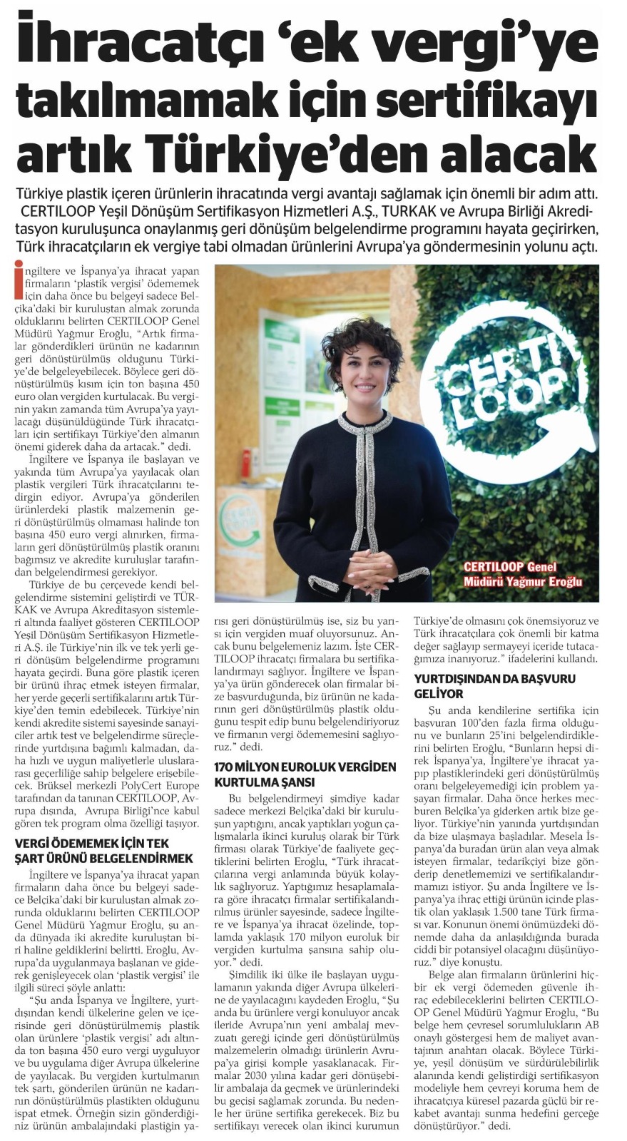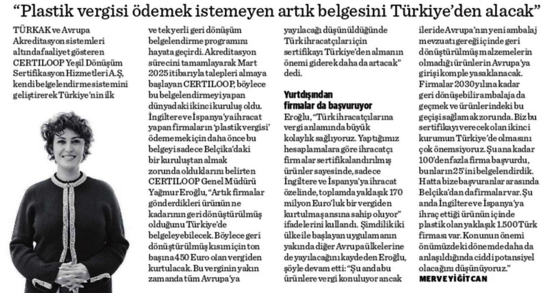 İngiltere ve İspanya'ya ihracat yapan firmaların daha önce bu belgeyi sadece Belçika'da kurulu bir kuruluştan almak zorunda olduklarını belirten CERTILOOP Genel Müdürü Yağmur Eroğlu, şu anda dünyada iki akredite kuruluştan biri haline geldiklerini belirtti. Eroğlu, Avrupa'da uygulanmaya başlanan ve giderek genişleyecek olan 'AB plastik vergisi' ile ilgili süreci şöyle anlattı: